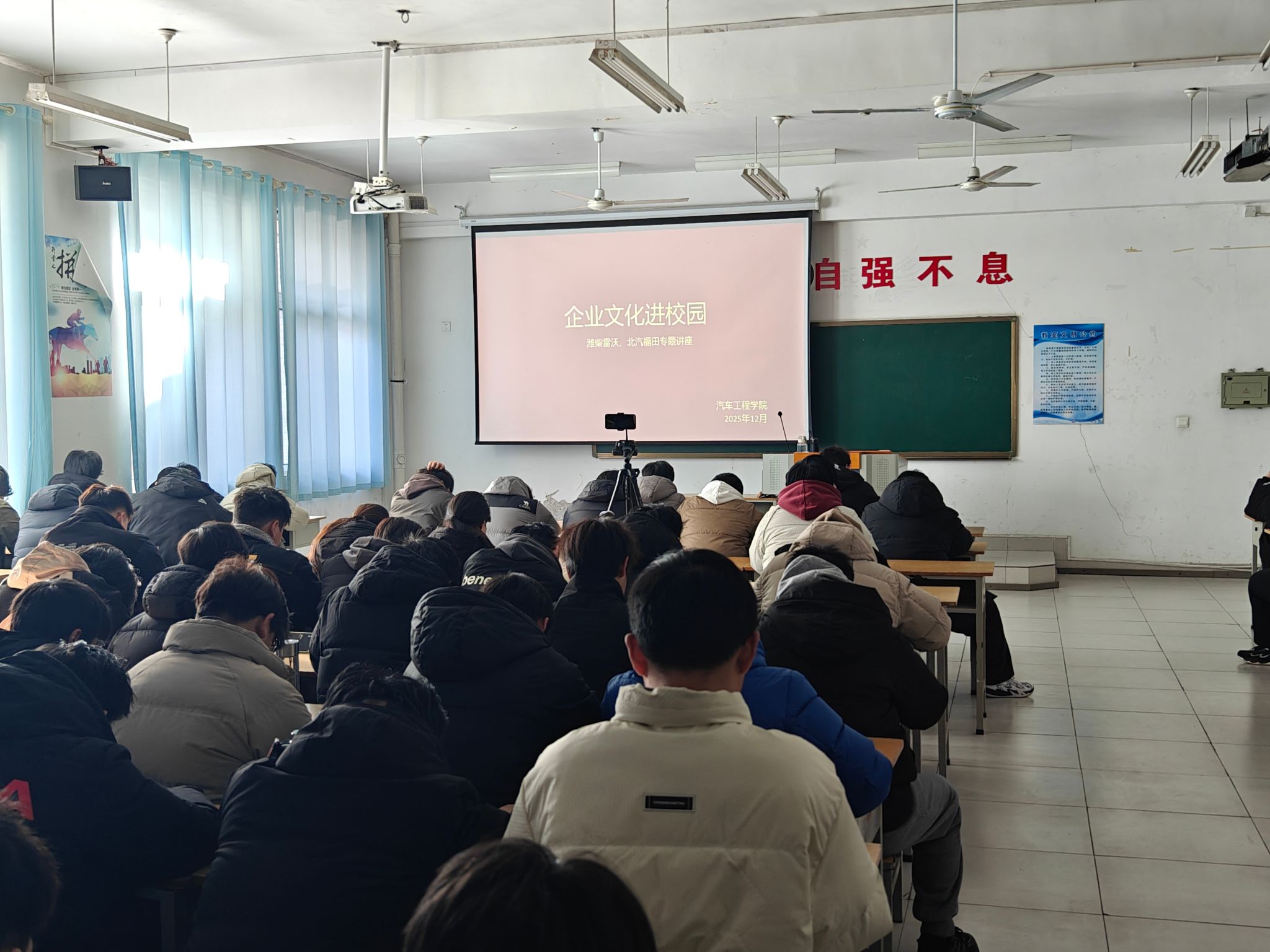 为深化校企合作,推动企业文化与校园文化融合,助力学生职业规划与成长,12月25日,北汽福田山东多功能汽车厂、潍柴雷沃智慧农业科技股份有限公司到汽车工程学院开展“企业文化进校园”专题活动。汽车工程学院相关负责人、产学合作办公室相关教师、汽车工程学院2024级全体学生参加活动。