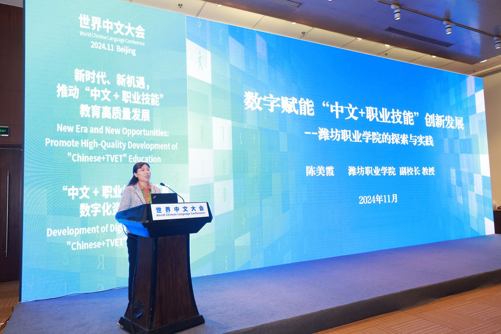 2024世界中文大会于11月15—17日在北京举办,主题为“联通融合 传承创新”,学院副院长陈美霞应邀参会。会议由中国教育部主办,中国教育部部长怀进鹏主持大会开幕式,国家副主席韩正致开幕词,宣读习近平主席贺信并致辞。
