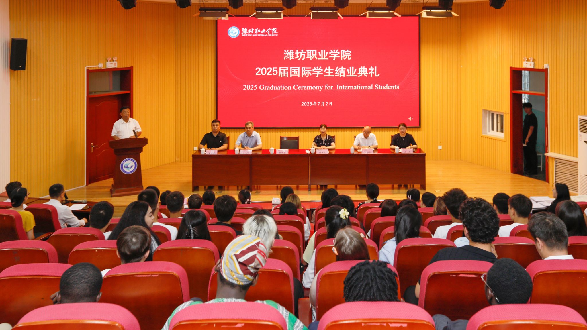 7月2日上午,学院2025届国际学生结业典礼在奎文校区6号楼报告厅举行。学院院长韩瑞东、副院长陈美霞、国际交流与合作处、学生工作处、教务处和安全保卫处相关负责同志以及国际教育学院全体师生共同参加典礼。陈美霞主持典礼。