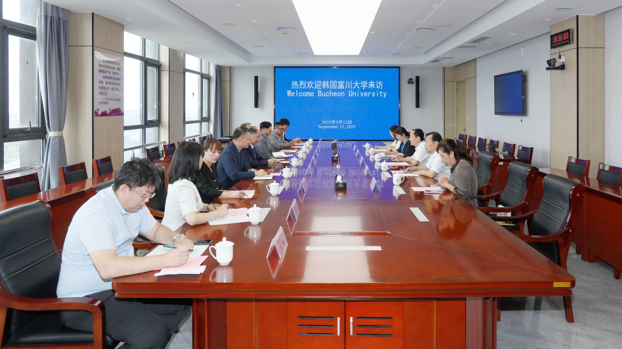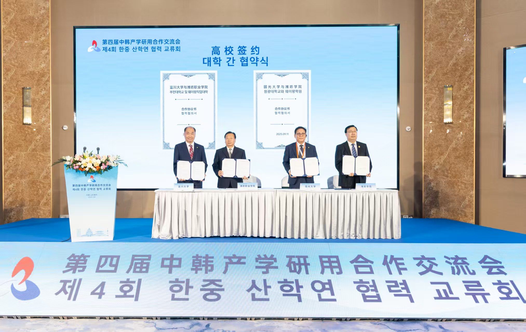 9月11日下午,第四届中韩产学研用合作交流会在潍理工酒店举行,MG冰球突破官网党委副书记贺志强代表学院与韩国富川大学签署合作协议。12日上午,韩国富川大学韩政锡校长一行9人来MG冰球突破官网访问,学院党委书记王浩、党委副书记贺志强在滨海校区会见了客人,国际交流与合作处负责人及相关同志共同参加会议。 贺志强主持会议。