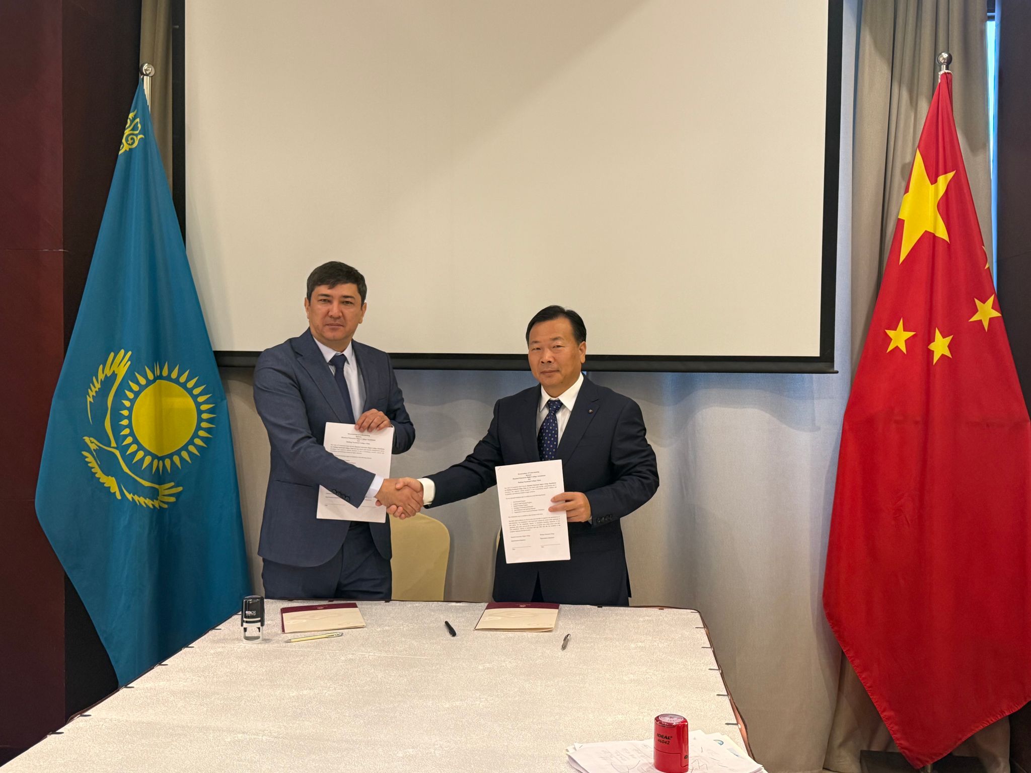 在哈萨克斯坦期间,代表团先后访问了贾母布尔高等理工学院、阿斯塔纳高等理工学院、中国电力建设集团哈萨克斯坦代表处、哈萨克斯坦中国总商会等多所高校、企业及机构。在贾母布尔高等理工学院,校长阿斯哈特、贾姆布尔州教育局科教部主任阿伊巴尔先生等热情接待代表团,双方正式建立友好合作关系并举行签约仪式,计划近期启动化学工程领域师生交流和技术培训项目。在阿斯塔纳高等理工学院,代表团与副校长阿瑟玛等举行会谈并签署合作意向书。在中国电力建设集团,双方围绕“中文+职业技能”培训需求开展深入交流,就共同培养具备中文沟通能力和专业技能的本土人才达成合作共识。在哈萨克斯坦中国总商会,代表团了解在哈中资企业对各领域技术技能人才的需求情况,为后续推进学生海外实习与本地员工培训找准方向。