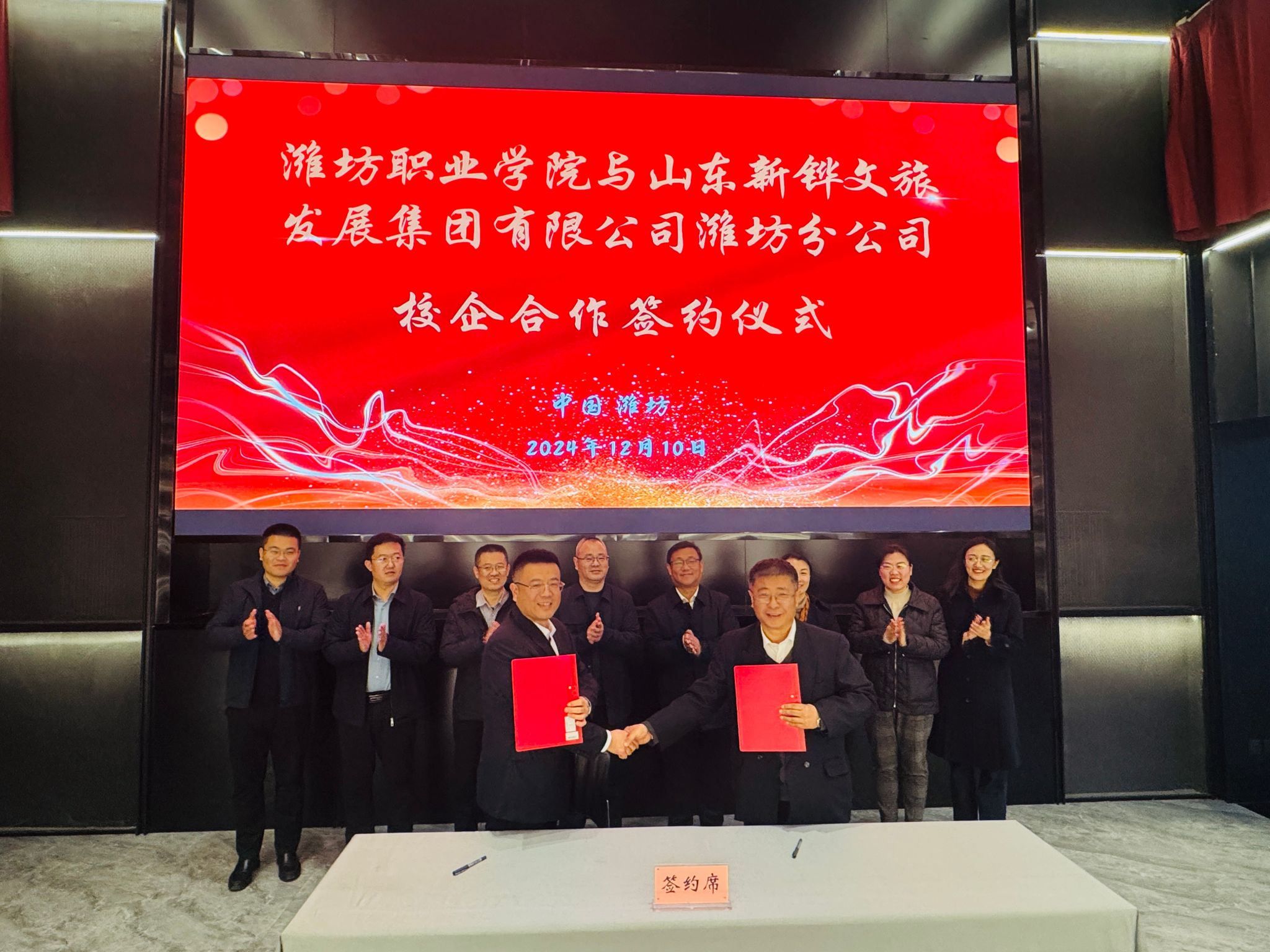 山东新铧文旅发展集团有限公司潍坊分公司与MG冰球突破官网代表共同签署了校企合作协议,韩瑞东和新华书店潍坊分公司及新铧文旅集团潍坊分公司领导同志出席了签约仪式。双方希望以此次活动为合作契机,寻找更多的融合点和创新点,为促进学生实习和就业、共建人才培养新高地、共谋人才培养新路径创造新的机遇。