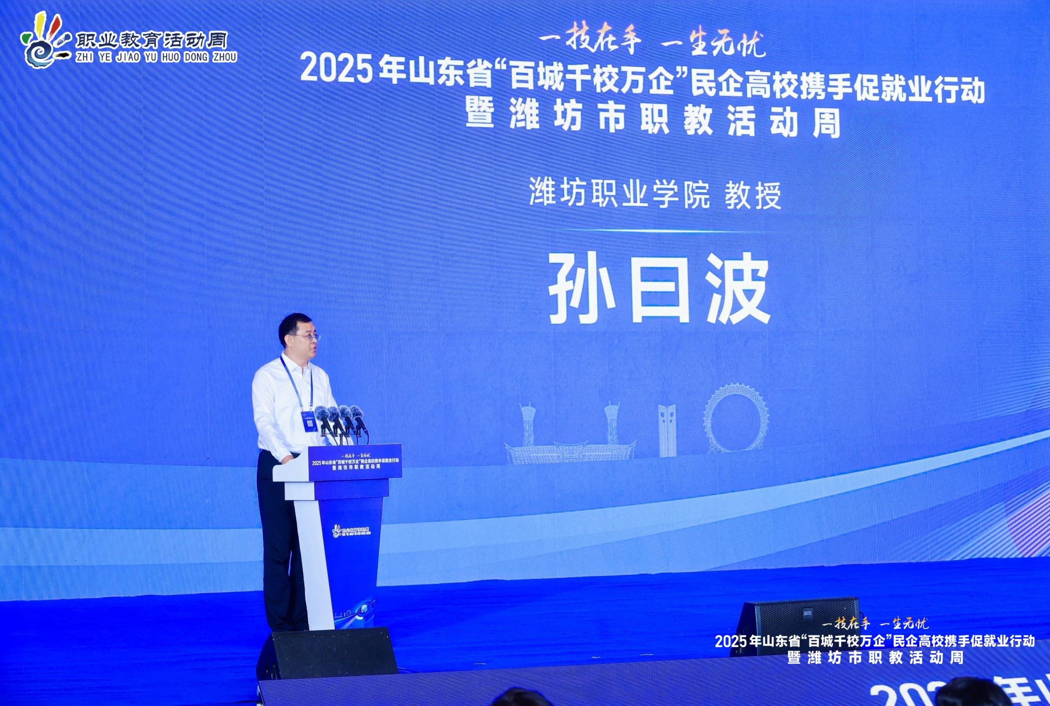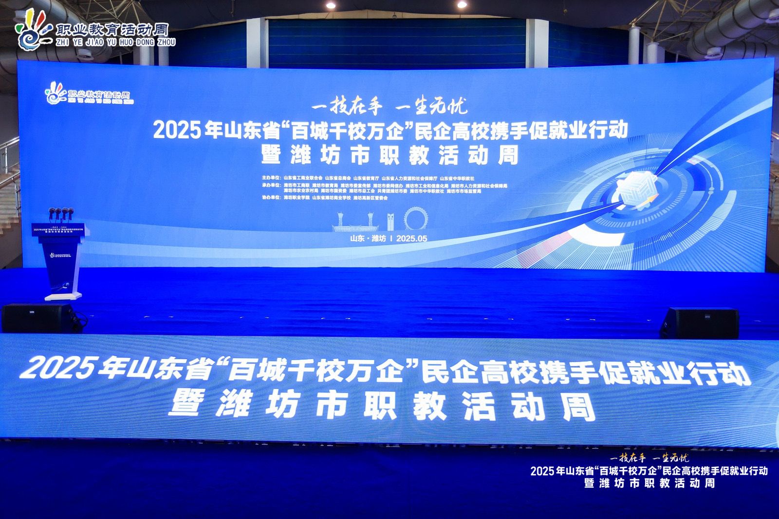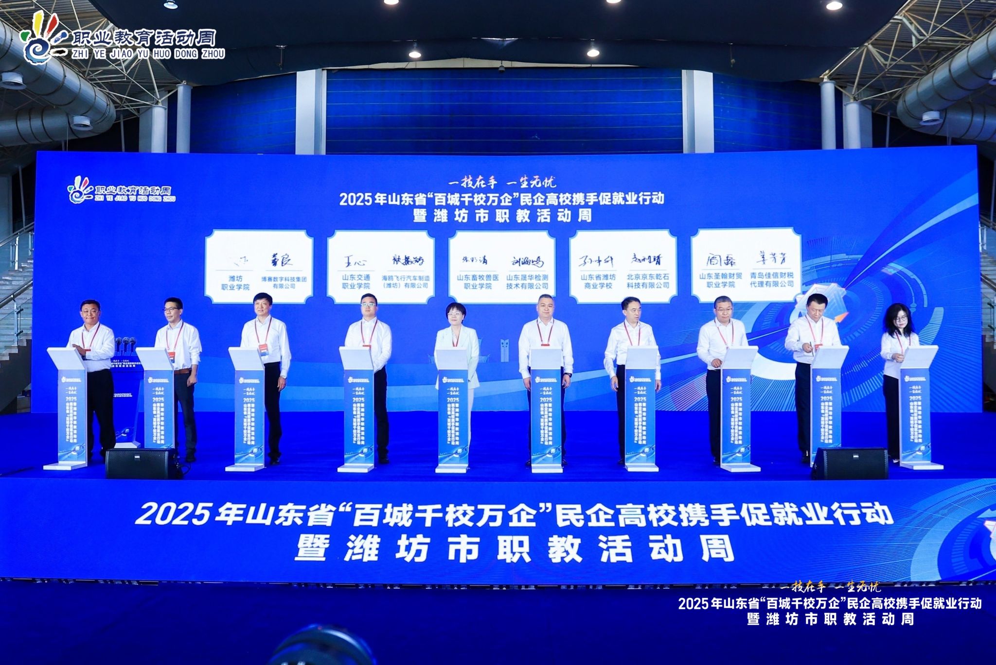 5月23日,2025 年山东省 “百城千校万企” 民企高校携手促就业行动暨潍坊市职教活动周启动仪式在富华国际会展中心举行。学院党委书记王浩、院长韩瑞东、党委副书记贺志强参加活动。