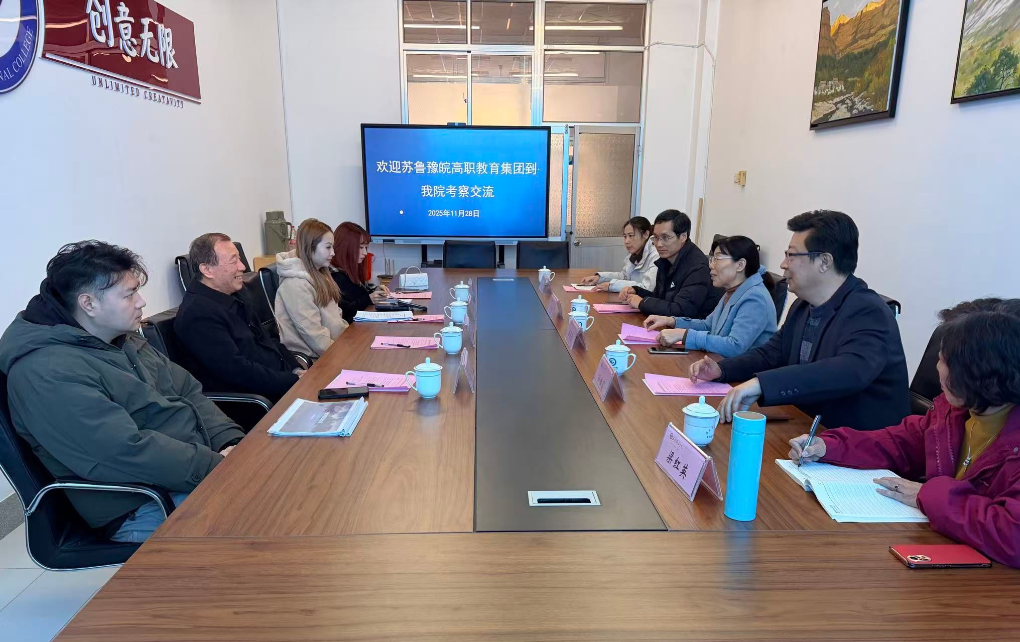 11月28日上午,苏鲁豫皖高职教育集团年维佳董事长一行四⼈到MG冰球突破官网洽谈交流。学院副院长陈美霞在奎文校区会见客人,通识教育中心、文化创意学院主要负责同志等相关人员参加会议。