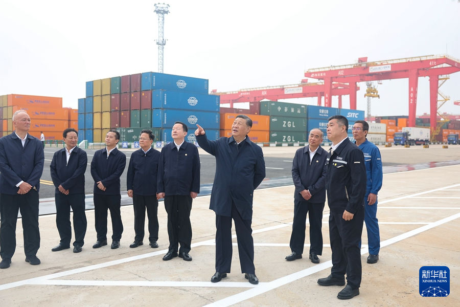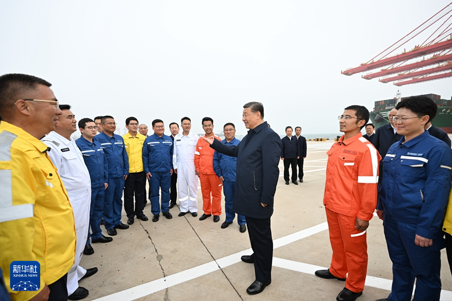5月22日至24日,中共中央总书记、国家主席、中央军委主席习近平在山东考察。这是22日下午,习近平在日照港亲切慰问港口科技工作者、运营人员、航运人员。
