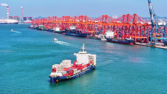 一艘装载出口新能源汽车零配件集装箱的货轮驶离广西钦州港(2024年10月24日摄) 张爱林摄/本刊