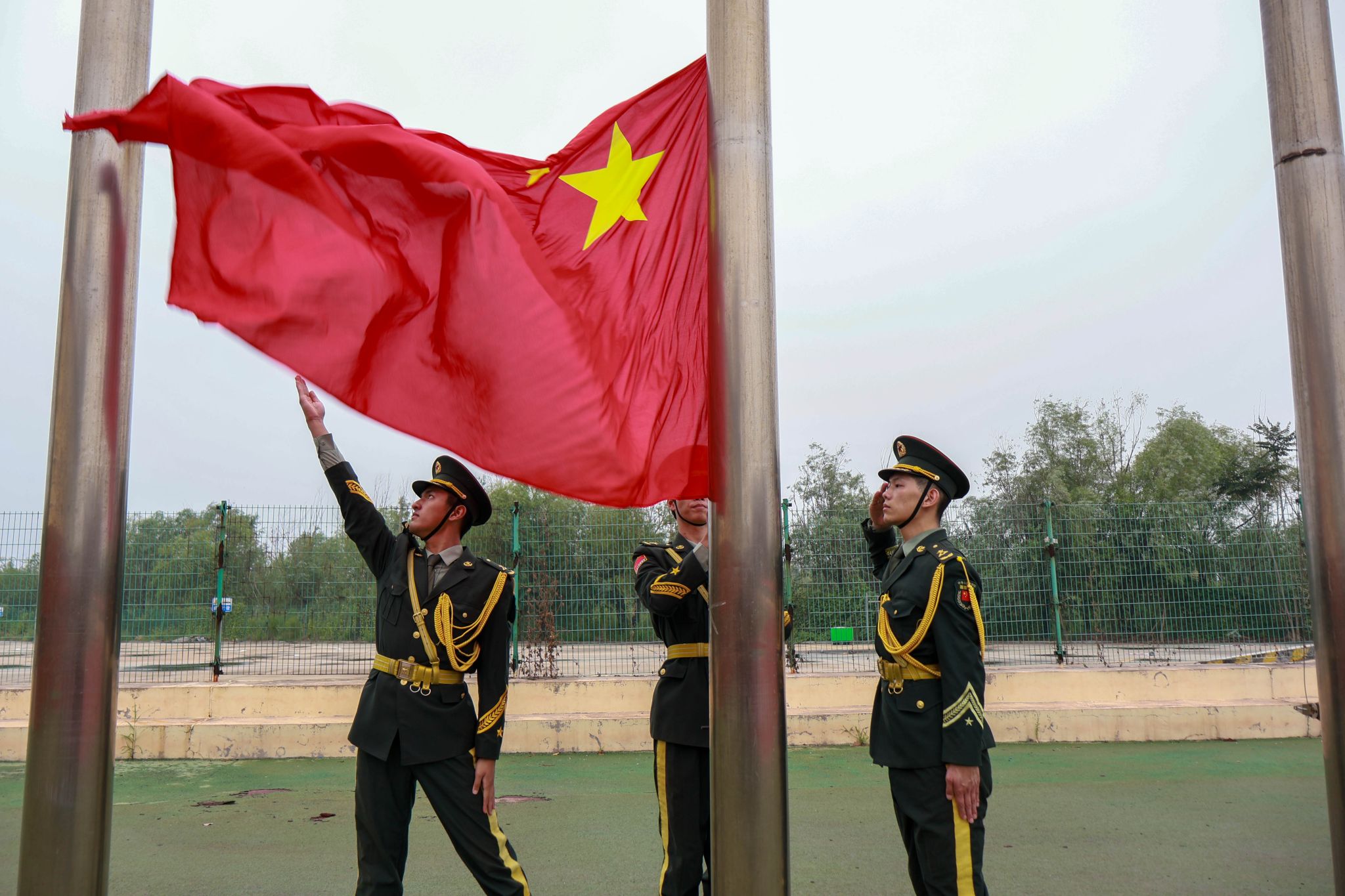 清晨阳光初照,校园操场庄严肃穆。7时整,英姿飒爽的国旗护卫队队员迈着整齐有力的步伐,护送鲜艳的五星红旗走向升旗台。随着激昂雄壮的《义勇军进行曲》,全体师生庄严肃立,面向国旗行注目礼,齐声高唱国歌。五星红旗在晨光中冉冉升起,随风飘扬,爱国之情在每个人心中油然而生。
