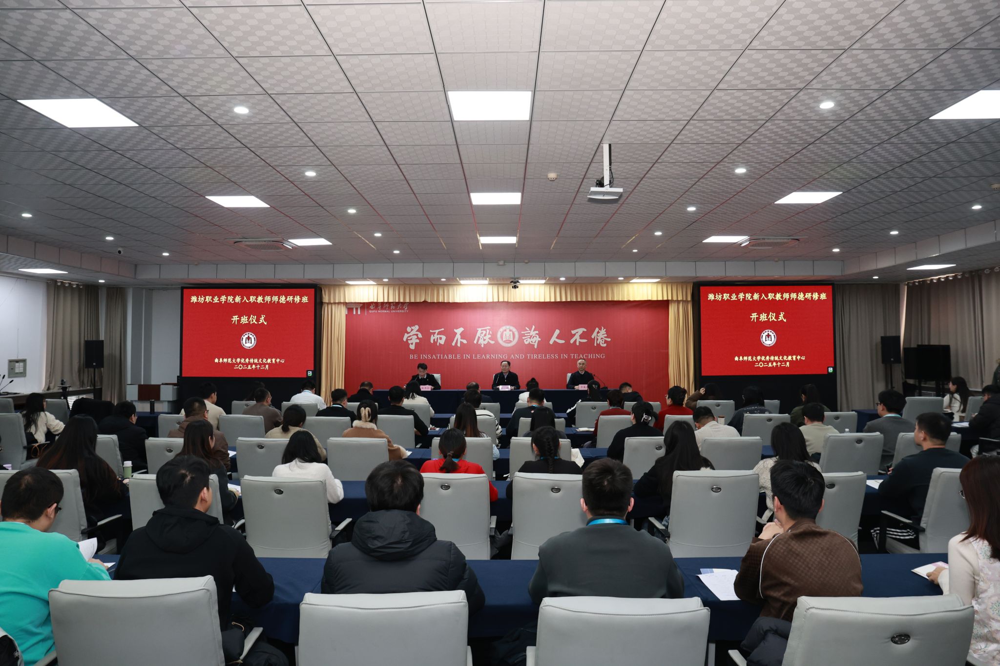 12月19日下午,开班仪式在曲阜师范大学举行。曲阜师范大学党委常委、副校长李兆祥出席仪式并致辞。学院党委书记王浩讲话,他首先对曲阜师范大学给予本次研修的大力支持表示衷心感谢。王浩指出,在儒家文化发源地开展师德教育研修,是引导教师从中华优秀传统文化中汲取智慧、深刻理解并自觉践行教育家精神的具体行动。他结合学院抢抓“建高升本”历史机遇、奋力实现“十五五”高质量发展目标新形势,对全体新教师提出期望与要求:一要坚守“立德树人”根本,淬炼育人初心;二要深悟“教育家精神”,筑牢信仰之基;三要汲取传统文化智慧,涵养师德底蕴;四要践行知行合一,提升育人本领;五要加强交流互鉴,凝聚团队合力。他勉励大家将研修所学转化为投身职业教育、培养高素质技术技能人才的生动实践。